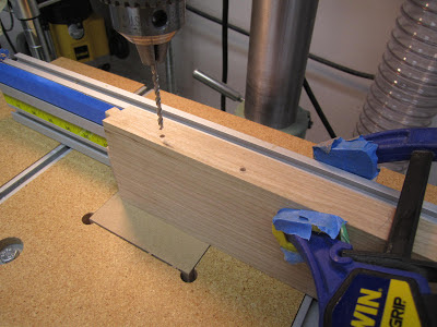 In the pictures above I drilled a 1/4" hole. I am transferring the hole location to the leg using a dowel center doohickee. In the Blacker House arm chair I actually cut little mortises. However, here I will use a dowel. Then I drill 1/4" holes into the legs where I marked the locations. Since side brackets hit the front legs at an angle, I cut a shim with the correct angle for drilling: